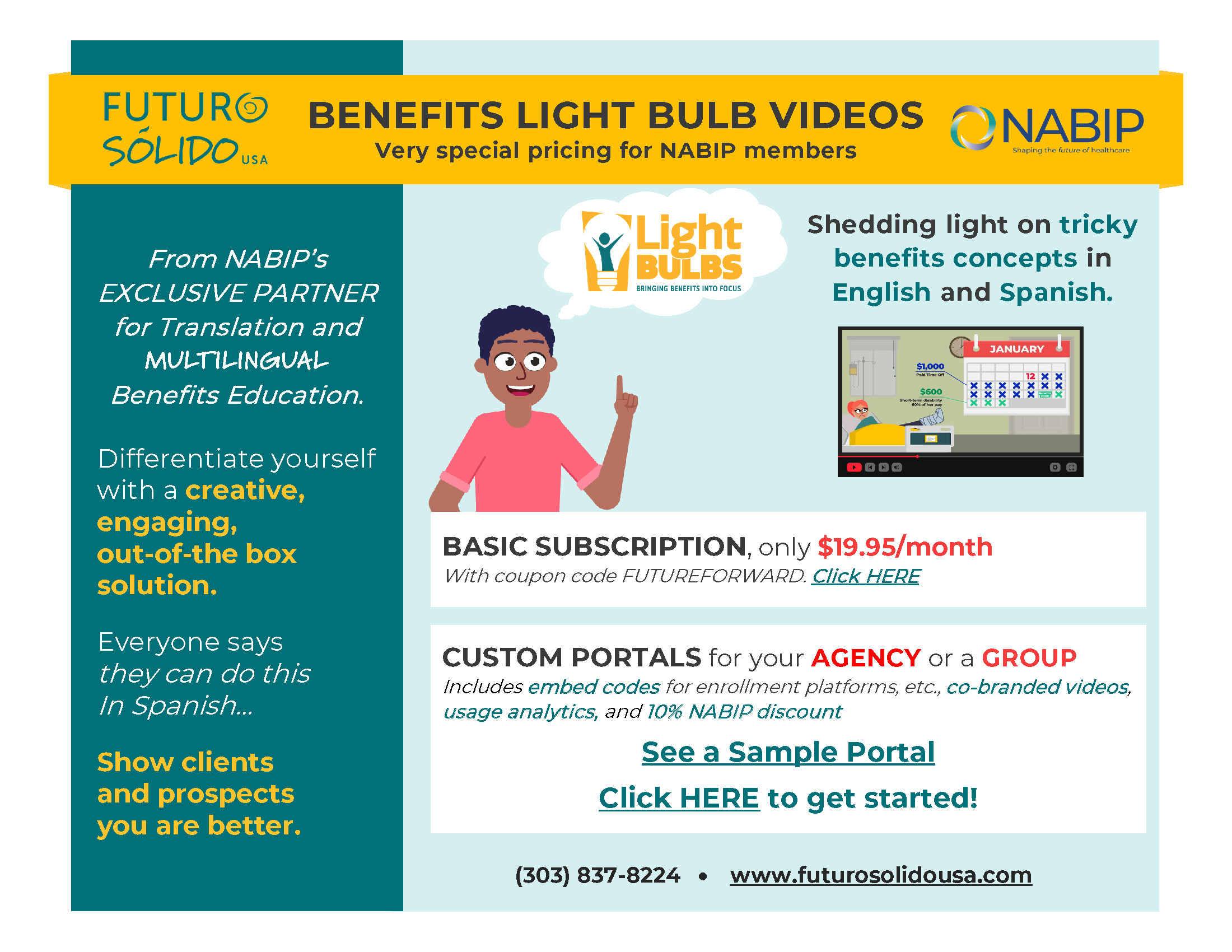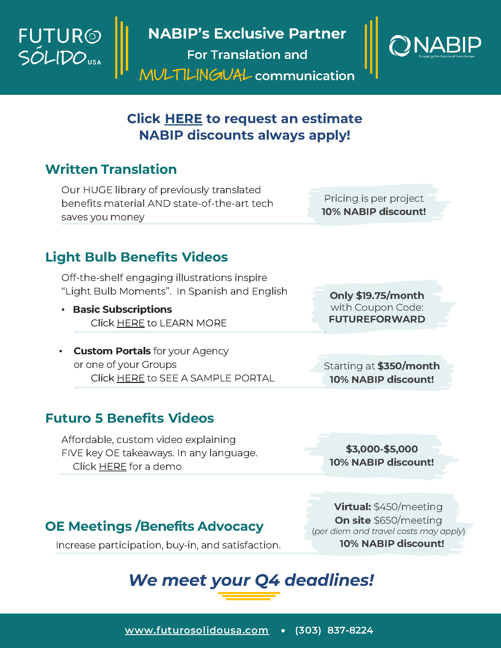 NABIP is excited to partner with Futuro Sólido to bring members discounted translation services and Spanish-language benefits videos. These tools make it easier to serve diverse communities—especially during open enrollment—by ensuring benefits communication is clear, consistent, and accessible.