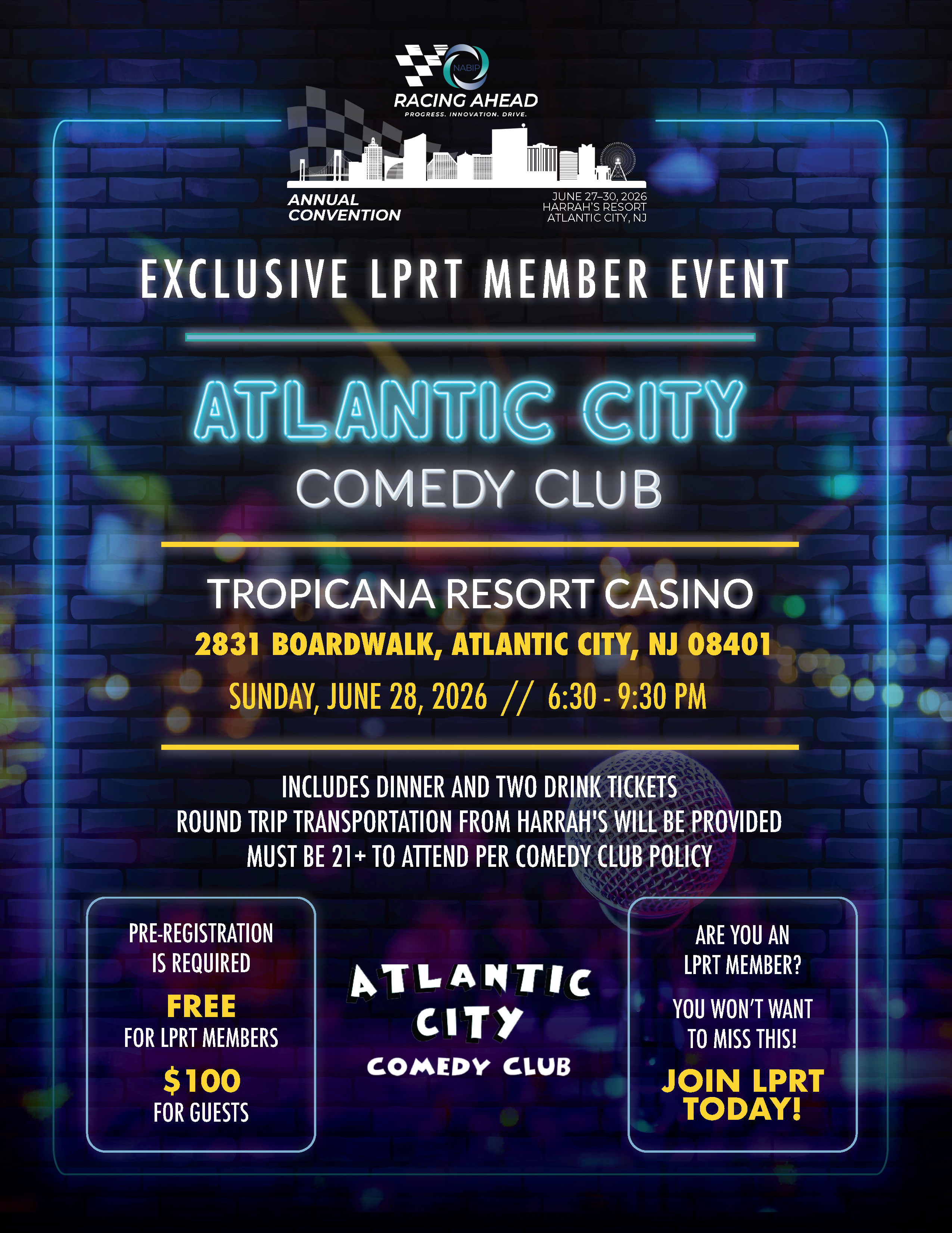 On Sunday, June 28, from 6:30–9:30 p.m., LPRT members are invited to enjoy a special dinner followed by an evening of comedy at the Tropicana Resort Casino. Get ready for a night of laughter and entertainment at one of Atlantic City’s premier venues. This event is complimentary for LPRT members and $100 for guests.